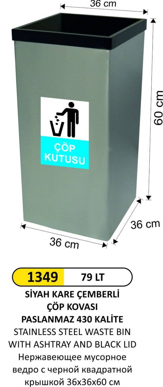 KARE PASLANMAZ SİYAH KAPAKLI ÇÖP KOVASI